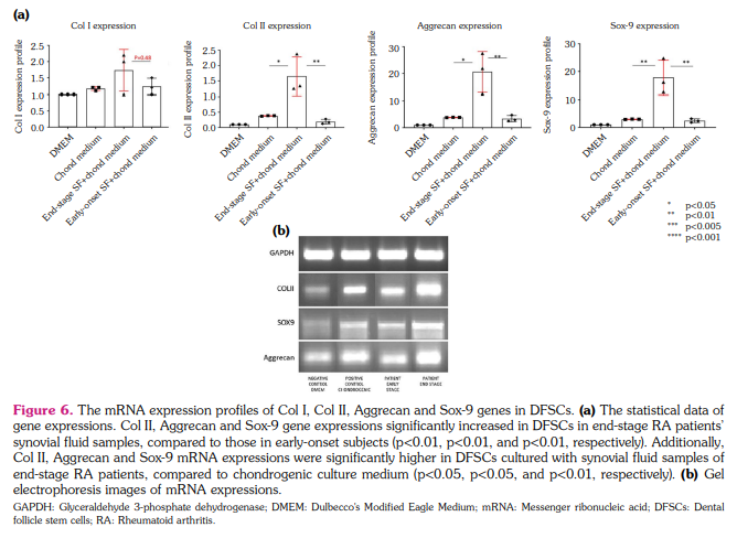 Patients and methods: Between May 2020 and January 2021, six patients (1 male, 5 females; mean age: 57.5±11.2 years; range, 49 to 65 years) who were diagnosed with RA with the indication of SF aspiration were included in the study. The third passage dental follicle stem cells (DFSCs) were cocultured with fresh SF samples of end-stage or early-onset RA patients in micromass culture system for 21 days. SF samples were analyzed for secreted cytokines. Chondrogenic markers (CD49e, CD49f) were analyzed in DFSCs, gene expression analysis was performed for the expressions of Col I, Col II, Aggrecan and Sox-9, and histochemical analysis was performed by staining three-dimensional pellets with anti-collagen II antibody. The neutralization assay was performed with anti-interleukin (IL)-6, anti-interferon-gamma (IFN-g), and anti-IL-1beta(b).