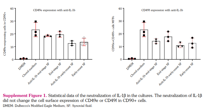 In the current study, we observed the correlation between high levels of IL-1β and IL-6 cytokine levels in SF samples and the chondrogenic differentiation potentials of DFSCs along with the differences in the results obtained in previous studies. Then, we conducted cytokine neutralization experiments to determine the responsible cytokine in the SF niche for chondrogenic differentiation. We analyzed the cell surface chondrogenic marker expressions on DFSCs with the neutralization of IL-6, IL-1β or IFN-γ by using anti-IL-6, anti- IL-1β and anti-IFN-γ neutralizing antibodies, respectively. The neutralization of IFN-γ was performed, since the effect of IFN-γ on the chondrogenic differentiation potential of DFCS is unknown.