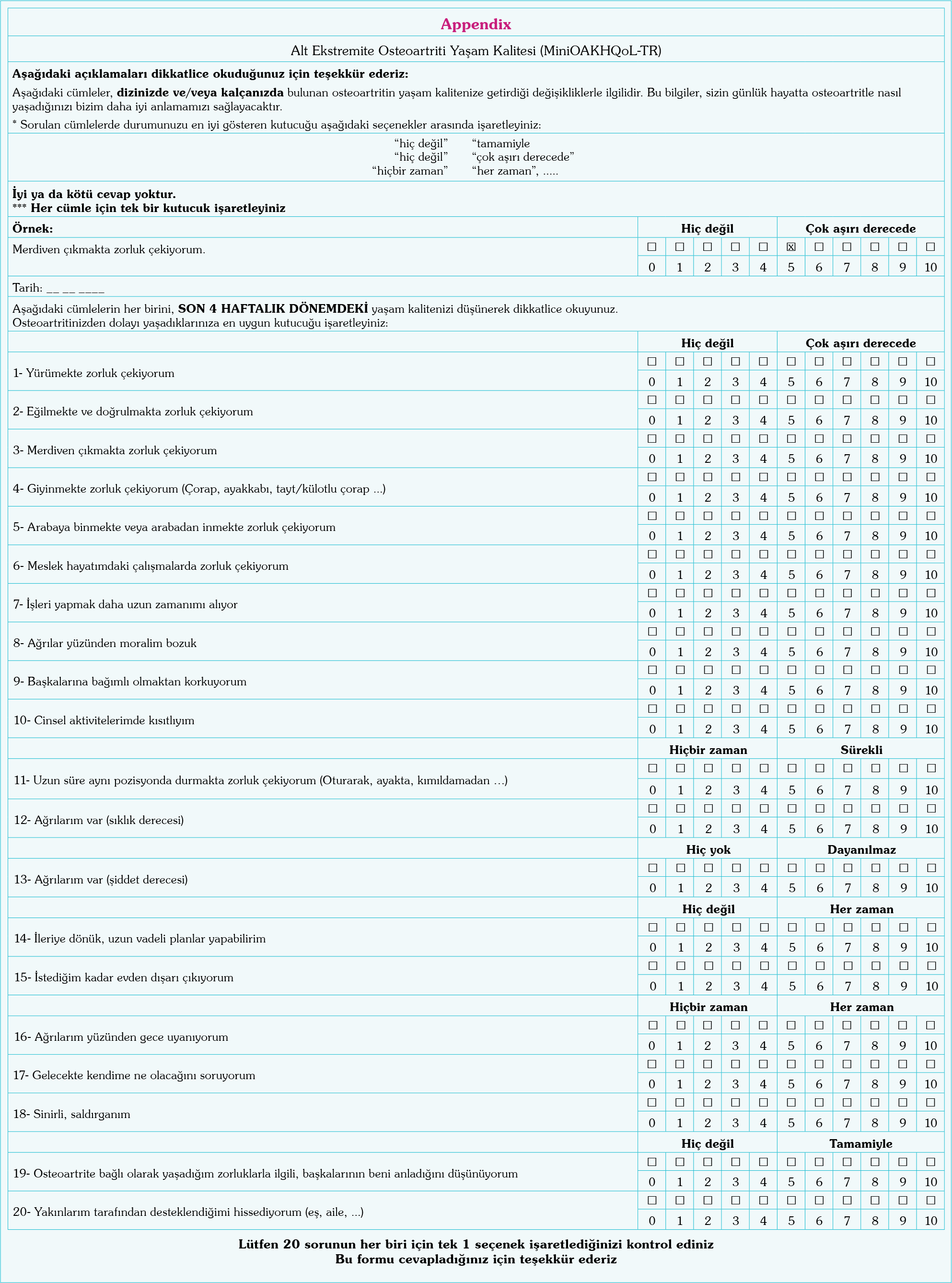 Citation: Duruöz MT, Acer Kasman S, Gezer HH, Duruöz E. Validity and reliability of the Mini-Osteoarthritis Knee and Hip Quality of Life scale in Turkish population. Arch Rheumatol 2022;37(1):119-128.