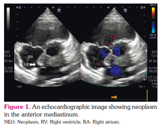A 25-year-old female patient presented to a rheumatologist with complaints of severe weakness, shortness of breath with mild physical exertion, palpitations, low-grade fever in the evening, tightness of the chest, and weight loss by 6 kg within the past four months. She reported that she felt herself ill for six months. Initial complains were shortness of breath, fever, and pressure pain behind the sternum. The patient consulted a cardiologist, and echocardiography revealed a neoplasm in the anterior mediastinum (Figure 1). The hypodense structure without clear contours, semicircular in the circumference of the non-coronary and left coronary sinus of the aorta, spreading and circularly enveloping the mouth of the left coronary artery, causing a narrowing of the lumen up to 70 to 80% was detected by intravenous contrast-enhanced computed aortography. A similar structure was identified along the pericardial layers in the circumference of the mouth of the pulmonary artery trunk (Figure 2). Due to the impossibility of the radical removal of the neoplasm to clarify the diagnosis, it was decided to perform a biopsy of the mass fragment. Stenting of the left coronary artery was performed. Laboratory test results were as follows: anemia (hemoglobin: 104 g/L); eosinophilia (relative numbers and absolute) 12%, 1.3-1.5x109 /L; erythrocyte sedimentation rate 53 mm/h, and C-reactive protein 31 g/dL. Detected serum immunoglobulin G4 (IgG4) in a high titer-1,030 mg/dL (normal range: 3 to 201 mg/dL). Antineutrophilic cytoplasmic antibodies to myeloperoxidase (ANCA-MPO) were in high titer: 5.2 AI. On multislice computed tomography (MSCT) of the thorax with bolus enhancement, the contrast was accumulated along the periphery and in both lungs with multiple ring-like foci, close to the density of “ground glass” appearance.