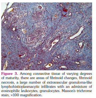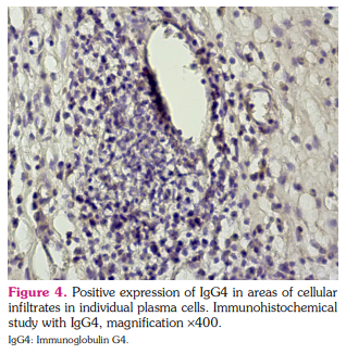 According to the pathohistological biopsy evaluation, fragments of connective tissue of varying degrees of maturity, focal fibrinoid necrosis, hyalinosis were observed and fibrous tissue was diffusely infiltrated with extravascular granuloma-like lymphohistioplasmacytic cells with an admixture of eosinophilic leukocytes, granulocytes with cellular infiltrates, among which there was focal deposits of fibrinoid masses (fibrinoid necrosis) (Figure 3). An immunohistochemical study revealed a positive expression of IgG4 in the individual plasma cells and in cellular infiltrates (Figure 4). Based on these findings, the patient was diagnosed with ANCA-associated vasculitis, EGPA.