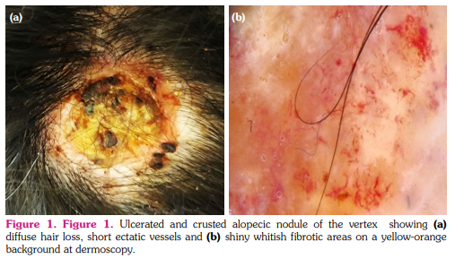 Primary localized nodular cutaneous amyloidosis is the rarest form of primary localized cutaneous amyloidosis, accounting for 1.5% of all cases, and differentiates fromthe other forms (lichen amyloidosis and macular amyloidosis), since amyloid deposits are not cytokeratin-derived, but originate from immunoglobulin light chains produced by dermal plasma cell infiltrates.[1,2] In general, PLCNA presents as waxy, skin-colored or orange nodules, usually located on the acral extremities.[3] In case of scalp involvement, the differential diagnosis may include cutaneous metastasis, non-melanoma skin cancer, Merkel cell carcinoma, and primary cutaneous B-cell lymphoma.[2] It also shares dermoscopic features of granulomatous disorders including orange background and teleangectasic vessels. Reddish structureless and whitish area and ulcerations were also reported.[4]