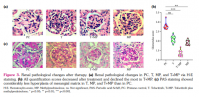 Apart from local sclerosis, hyperplasia of mesangial matrix was also observed around glomerular mesangial cells in PC. Hyperplasia of mesangial matrix was diminished in T, MP, and T+MP (Figure 3c).