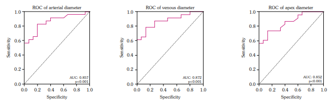 In the ROC analysis for determining cut-off values for arterial diameter with 83% sensitivity and 80% specificity, 30.10 µm (area under the curve [AUC]: 0.857; 95% confidence interval [CI]: 0.737-0.976; p<0.001), for venous diameter with 36.46 µm (AUC: 0.872; 95% CI: 0.762-0.983; p<0.001), for apex diameter with 43.85 µm (AUC: 0.852; 95% CI: 0.735-0.969; p<0.001) cut- off values (Figure 3).