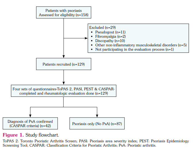 - Mishra S, Kancharla H, Dogra S, Sharma A. Comparison of four validated psoriatic arthritis screening tools in diagnosing psoriatic arthritis in patients with psoriasis (COMPAQ Study). Br J Dermatol 2017;176:765-70. DOI: 10.1111/bjd.14929