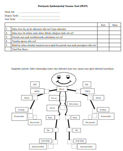 Psoriasis epidemiology screening tool: The questionnaire contains five questions (19). Each question answered "Yes" is scored 1 (one), while each question answered as "No" is scored 0 (zero) and then, the total score is calculated by summing the all item scores of PEST. Questions 1-5 are as follows: 1. Have you ever had a swollen joint (or joints)?; 2. Has a doctor ever told you that you have arthritis?; 3. Do your fingernails or toenails have holes or pits?; 4. Have you had pain in your heel?; 5. Have you had a completely swollen and painful finger or toe for no apparent reason?, respectively.