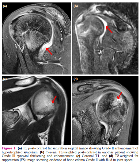 In addition, the presence or absence of synovial effusion on MRI was also noted. Joint effusion was seen as hyperintensity adjacent to synovium on post-contrast T1-weighted images.