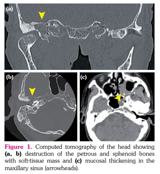 Positive results for ANCA are sometimes seen in patients with infection, inflammatory bowel disease or malignancy, including malignant lymphoma (ML), and not just in cases of vasculitis.[1,2] The precise mechanisms remain unclear, but neutrophil infiltration in response to tissue damage by ML or lymphoid cell-derived factors have been hypothesized to produce ANCA.[3] Some reports have described cases of ML mimicking GPA with craniocervical or otolaryngologic manifestations, such as sinusitis, otitis, nasal obstruction and discharge, masses in the nasal cavity, hypertrophic pachymeningitis and infarction of the pons.[4,5] Although GPA was suspected due to craniocervical or otolaryngologic manifestations in these patients, no kidney involvement was found.[4] Malignant lymphoma should, thus, be considered in patients without typical presentations such as glomerulonephritis, but differentiating between the two entities is practically difficult. A previous study comparing ANCA-positive patients with a clinical diagnosis of AAV from those without a clinical diagnosis of AAV demonstrated that a higher ANCA titer (≥4 times the upper limit of normal) and the number of affected organ systems (≥2 organ systems) may help to discriminate AAV from other diseases with positive results for ANCA.[2] A study investigating the characteristics of primary skull base lymphoma showed the usefulness of MRI to distinguish ML from other pathologies mimicking ML.[6] The combination of imaging findings, restricted diffusion on diffusion-weighted imaging, surrounding hyperostosis, bony erosion and/or marrow signal replacement, and heterogeneous contrast enhancement may raise suspicion for skull base lymphoma.[6] Our patient exhibited a lower ANCA titer, and a soft-tissue mass in the right middle ear and mastoid cells, along with destruction of the petrous and sphenoid bones and contrast enhancement of the mass on MRI without other organ involvements, suggesting ML. As a result, ML should be excluded using the degree of elevation of the ANCA titer, affected organ systems and MRI findings, when GPA limited to the ears, nose and throat is suspected.