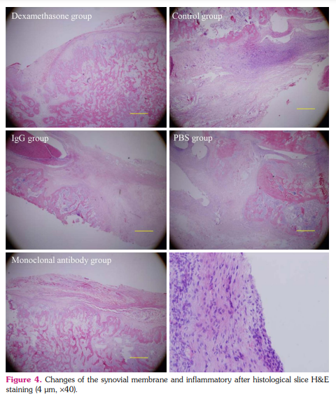 Treatment and division of experimental groups: The rats were randomly divided into five groups including the blank control group, the PBS-treated CIA group (the negative control), the dexamethasone-treated CIA group (0.5 mg/kg, the positive control), IgG-treated CIA group (2.5 mg/kg, the positive control), and the anti-RANKL monoclonal antibodytreated CIA group (2.5 mg/kg),[14,15] with 10 rats in each group. After the success of modeling, the groups of the test intervention were diluted to same volume with PBS as solvent. Drugs were given through intraperitoneal injection, the positive drug group (dexamethasone) was injected every other day and treated for 21 days. The IgG group and anti-RANKL monoclonal antibody group were injected every four days and treat for 24 days. The PBS with the same volume was given to the control group, and the dosage was as the same as the antibody intervention group.