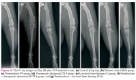 Before the begging of the study, the joints of rats were determined to be free of any radiological abnormality. The rats were anesthetized with sevoflurane and were positioned ventrodorsally on a table and X-ray image was obtained in the posterior-anterior view of the right knee joints with a stationary X-ray machine (Mex-100, Medical ECONET, Oberhausen, Germany) at 12 mA/s, 40 kV on Days 14 and 28. Two different blind observers performed radiological visual scoring, and visual scoring values were calculated based on the following conditions;[23] erosions: 0-3 (none, mild, moderate, severe); joint space narrowing: 0-3 (none, minimal, moderate, severe); joint space destruction: 0-3 (none, minimal, extensive, ankylosis).