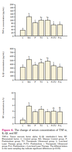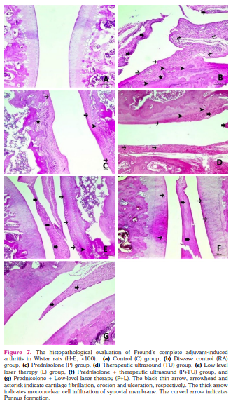 Materials and methods: A total of 56 adult male Wistar rats were divided into seven groups: control (C), disease control (RA), P, TU, LLLT (L), P + TU (P+TU), P + LLLT (P+L) groups. The skin temperature, radiography, joint volume, serum rheumatoid factor (RF), interleukin (IL)-1β, serum tumor necrosis factor-alpha (TNF-α), and histopathological evaluation of joint were performed.