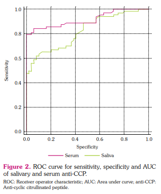 According to our ROC analysis, the salivary and serum AUCs were estimated as 81.8% and 91.7%, respectively. Similar to other studies, our study confirmed the higher specificity of the corresponding antibody (in this study anti-CCP3) for the diagnosis of RA.
