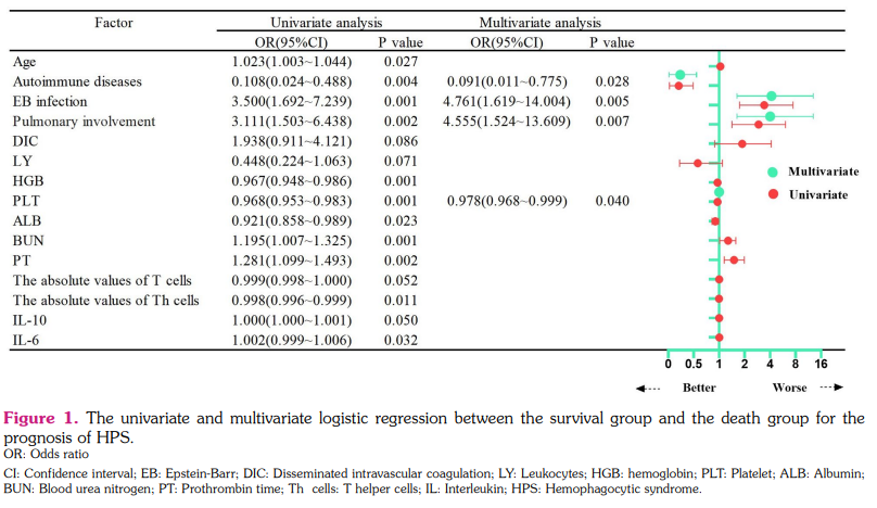 The patients were divided into survival and death groups according to prognosis. The clinical and laboratory features, treatment of HPS between the survival and death group are summarized in supplement Table 2. Univariate logistic analysis demonstrated that the prognosis of adult HPS was affected by the following factors: sex, the underlying disease, EBV infection, pulmonary involvement, HGB, PLT, albumin, blood urea nitrogen (BUN), prothrombin time, the absolute values of T helper cells, and the level of IL-6 (p<0.05, Figure 1). Putting the above meaningful indicators into the logistic model, the forward stepwise method was used for multivariate analysis. Finally, the hospitalization survival analysis demonstrated that the patients with AAHS had a better prognosis compared with other etiologies (OR=0.091, 95% confidence interval [CI]: 0.011-0.775, p=0.028, Figure 1). EBV infection (OR=4.761, 95% CI: 1.619-14.004, p=0.005) and pulmonary involvement (OR=4.555, 95% CI: 1.524-13.609, p=0.007) were independent predictors of poor outcome in HPS. Thrombocytopenia (OR=0.978, 95% CI: 0.968-0.999, p=0.040) had a boundary effect on prognosis.