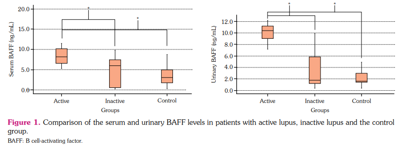 Conclusion: There is a significant positive correlation between serum and urinary BAFF levels and SLE disease activity. Furthermore, significantly higher levels of s-BAFF and u-BAFF have been observed in patients with active lupus compared to inactive and healthy subjects, indicating a possible role for BAFF in the pathogenesis of SLE disease activity.