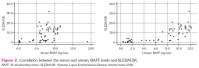 There is controversy over the relationship between s-BAFF levels and lupus disease activity. Our study demonstrated a significant positive correlation between s-BAFF and u-BAFF levels and the SLEDAI-2K score. Most researchers agree that there is a significant correlation between the s-BAFF and SLE disease activity measured by the Safety of Estrogen in Lupus Erythematosus National Assessment (SELENA)-SLEDAI.[15,24-31] On the other hand, some studies did not conclude a relationship between this variable and SLE disease activity quantified by SELENASLEDAI and the Systemic Lupus Activity Measure.[11,19,21,26,32] Collins et al.[33] suggested that elevated BAFF mRNA (messenger ribonucleic acid) levels in peripheral blood mononuclear cells correlate more precisely with lupus disease activity than s-BAFF protein levels. There is also a debate over the longitudinal relation between changes in s-BAFF levels and SLE disease activity. Although some studies failed to demonstrate this relation,[32,34] Petri et al.[24] proved a correlation between BAFF circulatory levels and SLE disease activity in the longitudinal assessment of SLE patients. Preliminary analysis of phase 3 randomized clinical trials in this area (BLISS-52 and BLISS-76) indicated that an s-BAFF level >2 ng/mL is an independent prognostic factor for moderate to severe lupus.[35]