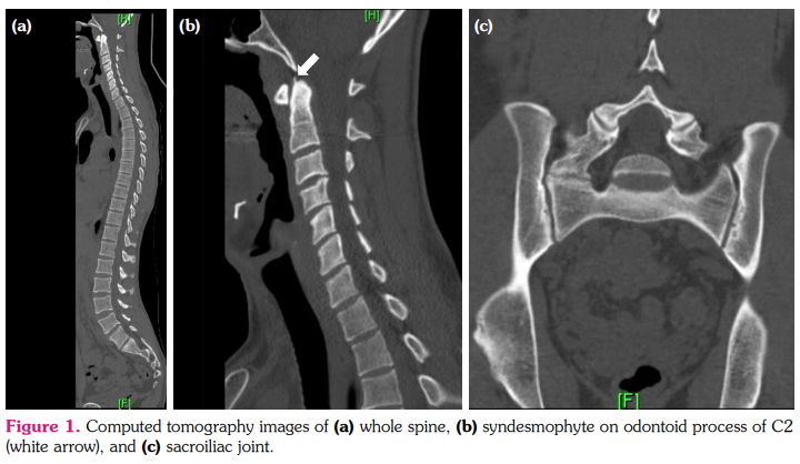 A 22-year-old male patient was admitted to the rheumatology clinic due to neck and back pain with morning stiffness for 12 months. He suffered from right knee and heel pain six months ago. He showed increased levels of high-sensitivity C-reactive protein (2.20 mg/dL, reference range: 0.01-0.3 mg/dL) and erythrocyte sedimentation rate (67 mm/h, reference range: 0-15 mm/h). To evaluate neck and back pain, the physician performed computed tomography (CT) of the whole spine. The CT finding was absence for herniated nucleus pulposus nor neural foramen stenosis. All vertebral corners of whole spine were clear (Figure 1a), except for bony spur at odontoid process of C2 (Figure 1b, white arrow).