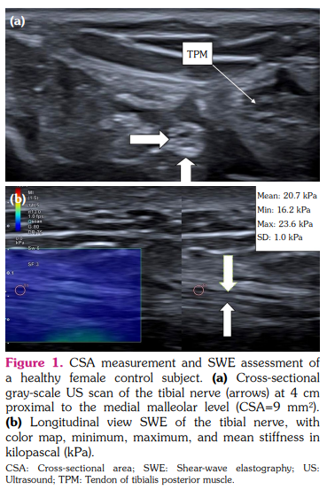 Citation: Kaymaz S, Yiğit M, Ufuk F, Sarılar B, Karasu U, Çobankara V, et al. The evaluation of tibial nerve using shear-wave elastography and ultrasound in patients with systemic sclerosis: A cross-sectional study. Arch Rheumatol 2023;38(4):556-565. doi: 10.46497/ ArchRheumatol.2023.9835.