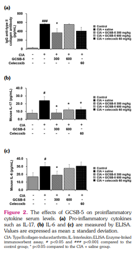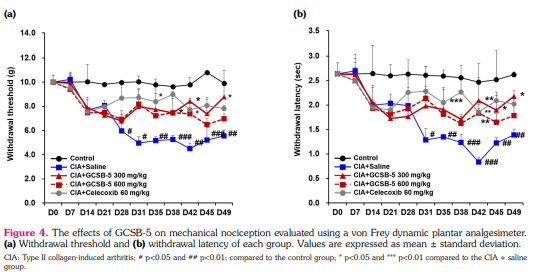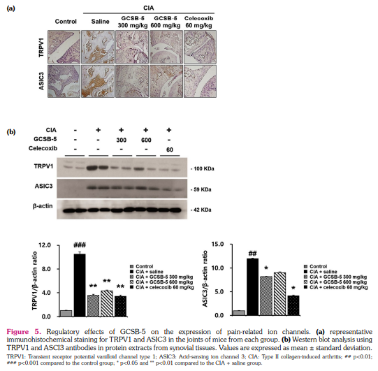 Results: GCSB-5 treatment diminished the severity of clinical arthritis and increased the nociceptive threshold in mice with CIA. Celecoxib, a positive control drug, also showed comparable changes. Clinical arthritis scores were inversely related to mechanical thresholds. GCSB-5 administration decreased the levels of anti-type II collagen antibody and inflammatory cytokines in the sera of mice with CIA. Furthermore, ERK, p38 MAPK, and JNK phosphorylation were downregulated and TRPV1 and ASIC3 expression were decreased in the synovium of GCSB-5-treated mice compared to salinetreated mice. Interleukin-6-induced TRPV1 and ASIC3 upregulation were also inhibited by GCSB-5 in human RA fibroblast-like synoviocytes in vitro.
