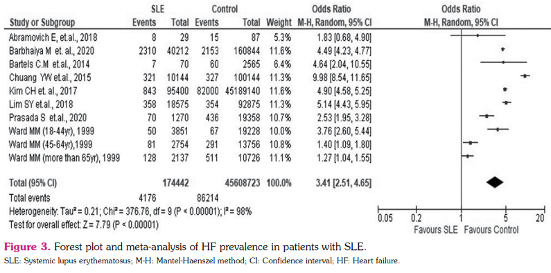 Prevalence of HF was reported in eight papers, including 174,442 SLE patients and 45,608,723 controls. The mean age of the participants was 47.9±7.1 years, and 16,888 of the participants were male, whereas 157,554 were female. HF rate in SLE patients was 2.39% (n=4,176) and showed 3.4 times higher risk in patients with SLE compared to controls (OR=3.41, 95% CI: 2.51-4.65, p<0.00001, Figure 3). Prevalence of HF in controls was 0.19% (n=86,214).
