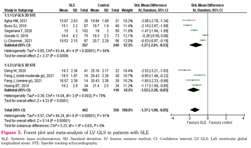 Eight selected studies measured the LVGLS of 462 SLE patients and 356 controls. The mean age of the participants was 36.7±10.9 years, and 50 of the participants were male, whereas 412 were female. LVGLS was more deteriorated in SLE patients compared to controls (SMD= –1.37, 95% CI: –1.90 to –0.85, p<0.00001, Figure 5). Three studies (four groups) from selected publications had performed a 3D STE-derived LVGLS assessment.[19-21] Subgroup analysis showed that 2D (SMD=–1.27, 95% CI: –2.01 to –0.53, p<0.0008) and 3D (SMD=–1.52, 95% CI: –2.20 to –0.83, p<0.0001) STE-derived LVGLS was significantly lower in SLE patients compared to healthy controls (Figure 5).