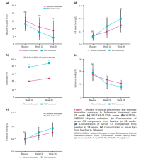 Clinical and serological improvements during belimumab treatment at weeks 12 and 24 were described (Figure 1). The mean SELENA-SLEDAI score declined from 15.0±4.8 to 11.7±6.0 at week 12 and to 8.9±6.4 at week 24 in the standard therapy group, and it decreased from 13.16±4.4 to 6.4±3.7 at week 12 and to 4.3±3.2 at week 24 in the belimumab group (Figure 1a).