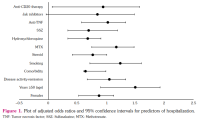 It was observed that the mean age and the rate of smoking were higher in hospitalized COVID-19 patients. Disease activity and receiving DMARDs were similar. Table 4 summarizes the characteristics of hospitalized and nonhospitalized patients. A plot of the variables with odd ratios for the predictors of hospitalization is shown in Figure 1.