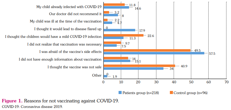 Results: Of the patients, 220 were followed up with the diagnosis of autoinflammatory disease, 174 with juvenile idiopathic arthritis, 48 with connective tissue disease, 23 with vasculitis, eight with uveitis, and one with sarcoidosis. In the study group, 256 (54%) patients and 115 (54.5%) healthy children received at least one dose of COVID-19 vaccine. Parents' concern regarding potential side effects of the vaccine was the most common reason for COVID-19 vaccination hesitancy in both groups. The median patient age, follow-up period, colchicine treatment rates, childhood vaccination and influenza vaccination rates, median parental age, parental vaccination rate, and parental education level were higher in vaccinated patients (p<0.001).
