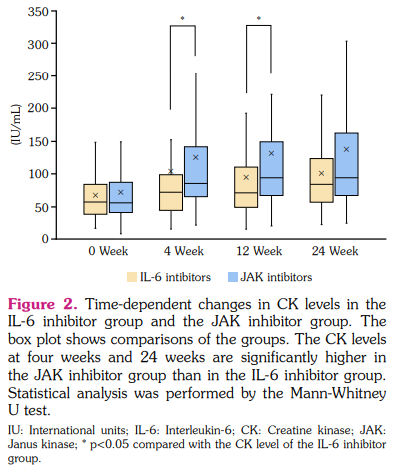 Creatine kinase levels were significantly elevated over time in the JAK inhibitor group compared to the IL-6 inhibitor group, with a difference in the outlier rate of over Grade 1. If the CK elevation is an indirect effect of decreased disease activity, improved quality of life, or increased activity, CK should be elevated not only in the JAK inhibitor group but also in the IL-6 inhibitor group. However, since the CK level was only slightly elevated with IL-6 inhibitors, it is possible that the CK elevation is due to a direct blocking of JAK-STAT signaling.