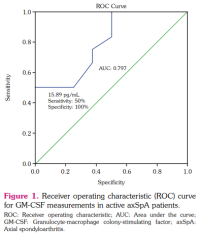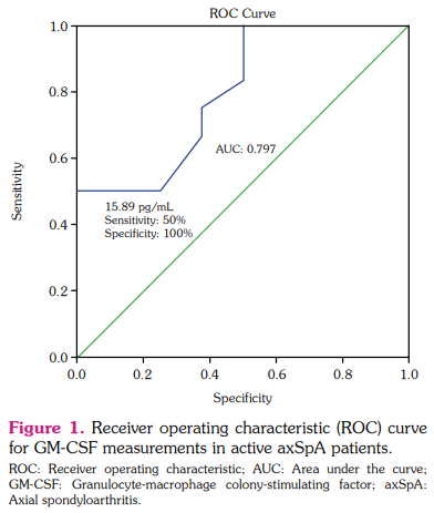 In our study, the cut-off serum GM-CSF value by ROC analysis for active disease in axSpA was 15.89 pg/mL, with 100% specificity. The fact that the specificity is 100% suggests that measuring serum GM-CSF levels can be a prominent option in the evaluation of disease activity in axSpA.