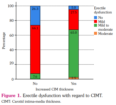 Univariate regression showed that age (p=0.022), hypertension (p=0.032), hyperlipidemia (p=0.002), having received treatment (p=0.017), insulin resistance (p=0.002), creatinine (p=0.007), testosterone (p<0.001), increased CIMT (p<0.001), and gout disease (p<0.001) were associated with erectile dysfunction. Multivariable logistic regression revealed that increased CIMT was the only factor independently associated with erectile dysfunction (odds ratio=3.723, 95% confidence interval: 1.363-10.172, p=0.010; Table 3, Figure 1).