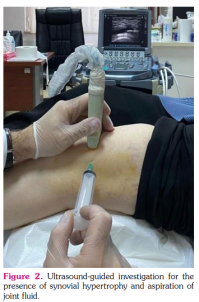 Synovial fluid samples were collected from patients with effusion in their knee joint under sterile conditions by a joint puncture for in vitro studies. Ultrasonography was performed to examine the patients before the sample collection. The presence of synovial hypertrophy in patients during the ultrasound examination was recorded. Synovial fluid samples were collected using sterile 10 mL syringes under ultrasonographic guidance (Figure 2). Three sterile culture tubes containing equal amounts of synovial fluid, ranging between approximately 2 to 5 mL, were used for each patient. One tube contained only synovial fluid, and the other two contained synovial fluid and ozone gas (1 mL of ozone gas for every 1 mL of the synovial fluid).
