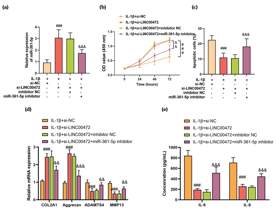 The miR-361-5p messenger RNA levels were increased in si-LINC00472-transfected chondrocytes and decreased in si-LINC00472 co-transfected chondrocytes with miR-361-5p inhibitor (Figure 5a). Downregulation of LINC00472 increased chondrocyte viability and inhibited apoptosis and ECM degradation, while miR-361-5p inhibitor reversed these results (Figures 5b-d). The miR-361-5p inhibitor also overruled the regulatory effect of si-LINC00472 on inflammation factor (Figure 5e).