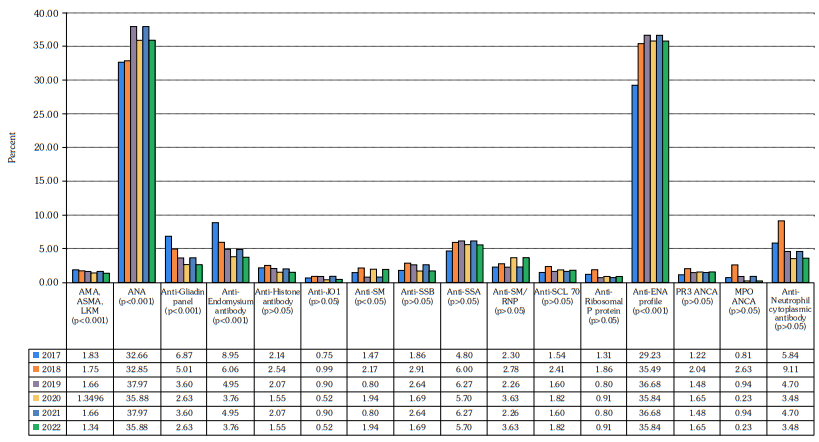 Conclusion: This study could not establish a cause-effect relationship between the changing autoantibody levels during the COVID-19 pandemic and severe acute respiratory syndrome coronavirus 2 infection due to the lack of results from the same patients across different periods. Nonetheless, we believe the quantitative seroprevalence changes in such a large sample of autoantibody screening results over a five-year period, including the pandemic, are valuable.