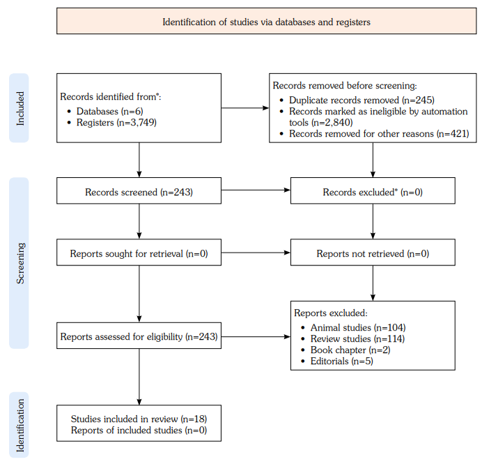 * Consider, if feasible to do so, reporting the number of records identified from each database or register searched (rather than the total number across all databases/registers); ** If automation tools were used, indicate how many records were excluded by a human and how many were excluded by automation tools.