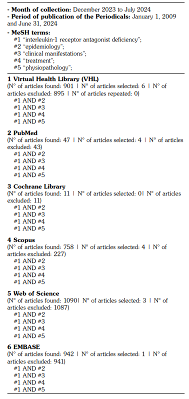 Materials and methods: A systematic review of the literature was conducted in the PubMed, Scopus, Web of Science, and the Virtual Health Library databases between January 2009 and June 2024 in accordance with the PRISMA (Preferred Reporting Items for Systematic Reviews and Meta-Analyses) protocol. The following MeSH descriptors were used: “interleukin-1 receptor antagonist deficiency,” “epidemiology,” “clinical manifestations,” “treatment,” and “physiopathology.”