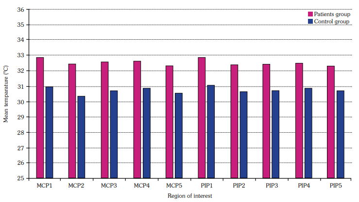 A comparison of thermal characteristics of the small joints of the hands between patients with rheumatoid arthritis and healthy controls