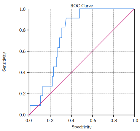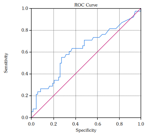 Based on the ROC curve analysis, the optimal PCSK9 cut-off value for plaque was 472.0 ng/mL, sensitivity 90.9%, specificity 65.0% (area under the curve [AUC]=0.759; 95% CI: 0.660-0.857, p=0.005). The optimal PCSK9 cut-off value for SA was 459.5 ng/mL, sensitivity 63.2%, specificity 63.0% (AUC=0.625; 95% CI: 0.512–0.739, p=0.031). Figures 2 and 3 show the ROC curves.
