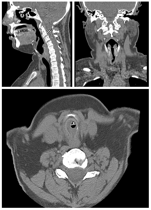 A 37-year-old female patient presented with symptoms of eye swelling, redness, protrusion, and shortness of breath. During examination, she had biphasic stridor, no edema in the nasal mucosa, and no saddle nose deformity. Elevated acute phase reactants and normocytic anemia were observed. Urine microscopy findings were normal, proteinuria was not detected, and immunological tests showed positive p-ANCA (perinuclear antineutrophil cytoplasmic antibody). Thorax computed tomography (CT) revealed stenosis below the cricoid cartilage and millimetrically small lymph nodes at this level, while no pathology was observed in the lung parenchyma. The biopsy results indicate the presence of inflammatory infiltration and edema in the submucosal layer, where a significant number of lymphocytes and neutrophils were observed. However, there was no evidence of granulomatous reaction. The patient was diagnosed with limited granulomatosis with polyangiitis (GPA), formerly called Wegener’s granulomatosis, based on clinical and laboratory findings and was treated with methylprednisolone and azathioprine. When dyspnea complaints increased, rituximab was started. The control neck CT revealed progression of stenosis in the subglottic region and increased concentric wall thickness, with the narrowest air column measured at 6 mm (Figure 1). During rigid bronchoscopy, the patient experienced respiratory arrest and required an emergency tracheostomy. A written informed consent was obtained from the patient.