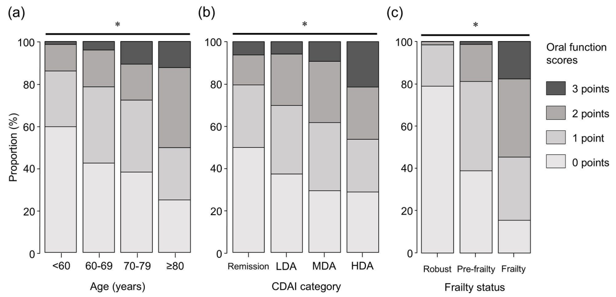 Figures 1a-c show proportions of patients with each oral function score by age group, CDAI category, and frailty status, respectively. The proportion of patients with oral function decline (oral function score ≥2 points) was significantly lower in patients aged <60 years compared to those aged ≥80 years (13.9% and 50.3%, respectively; p<0.001), in those in remission compared to those with HDA (20.6% and 46.4%, respectively; p<0.001), and in those who were robust in frailty status compared to those who were frail (1.6% and 54.8%, respectively; p<0.001), as assessed by the Cochran-Armitage trend test.