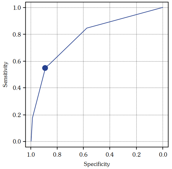 In the ROC curve analysis for frailty, the AUC was 0.790 (95% confidence interval [CI]: 0.756-0.824) for the oral function score (Figure 2). The optimal cut-off score for the oral function score corresponding to frailty was 2 points, with a specificity of 89.2% and a sensitivity of 54.8%, corresponding to the definition of oral function decline (i.e., total score of ≥2 for Questions 13 to 15 of the KCL).