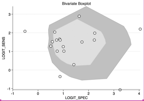 An LR scattergram (Figure 5) demonstrated that the estimates were in the right lower quadrant, indicating that it cannot be used for either confirmation or exclusion. Substantial heterogeneity was observed (I2 = 99%, P < .001), with a minor contribution from the threshold effect (proportion of heterogeneity due to threshold effect = 0.13) (Figure 6). The funnel plot (Supplementary Figure 2) was asymmetrical, and Deek’s test was significant (P= .01).
