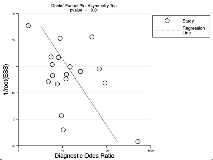 Publication bias was assessed using a funnel plot and Egger’s and Deek’s tests. P < .05 was indicative of publication bias. STATA version 14.2 (StataCorp.; TX, USA) was used for analyses.