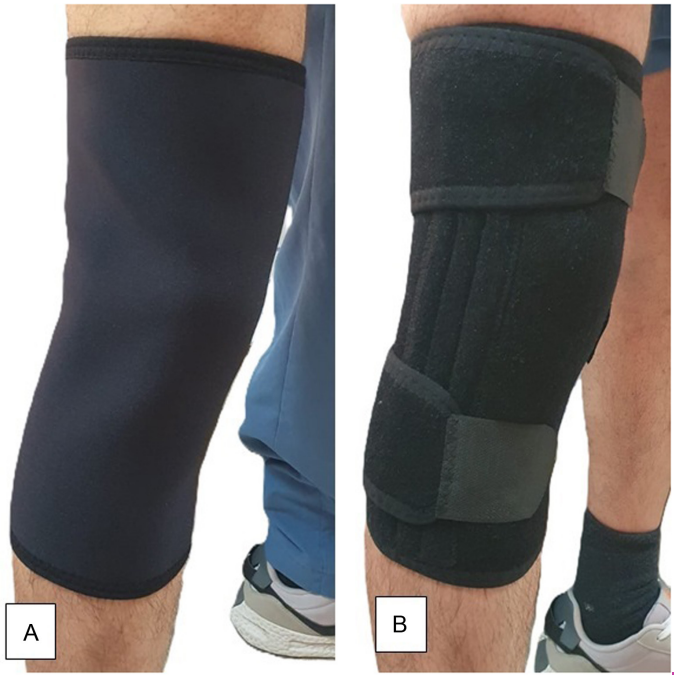 Neoprene elastic knee sleeve without patellar opening (ORSA® ;, model N-31 -Türkiye/Kiwa certified ISO13485) and neoprene knee sleeve with 4 metal supports; 2 supporting bars on each medial and lateral side without patellar opening (ORSA® ;, model N-31S –Türkiye/Kiwa certified ISO13486) were used in the study (Figure 1).