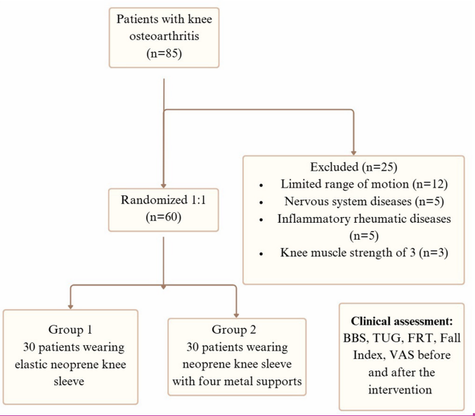 Initially, 85 patients diagnosed with knee osteoarthritis were examined for eligibility. Of these, 25 were excluded based on the study’s inclusion and exclusion criteria. The remaining 60 participants were randomized into 2 groups: Group 1 (n = 30), who wore an elastic neoprene knee sleeve, and Group 2 (n = 30), who wore a neoprene knee sleeve with 4 metal supports (Figure 3).