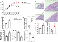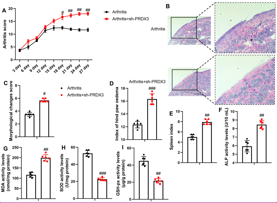 Next, the sh-PRDX3 virus was utilized to reduce PRDX3 expression in an osteoarthritis mouse model. Sh-PRDX3 elevated the arthritis score and cartilage injury (hematoxylin-eosin (HE) staining), increased the morphological changes score, hind paw edema index, and spleen index in osteoarthritis mice (Figure 2A-E). Furthermore, the sh-PRDX3 virus increased the activity levels of Alkaline Phosphatase (ALP) and MDA while reducing the activity levels of SOD and GSH-PX in the articular tissue of osteoarthritis mice (Figure 2F-I).