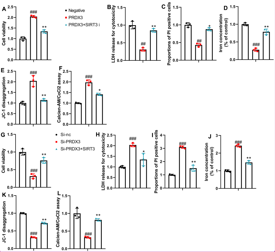 Next, the SIRT3 inhibitor also promoted ferroptosis and mitochondrial damage in the in vitro osteoarthritis model with the presence of PRDX3 (Figure 8A-F). However, the SIRT3 agonist reduced ferroptosis and mitochondrial damage in the in vitro osteoarthritis model with the intervention of si-PRDX3 (Figure 8G-L).