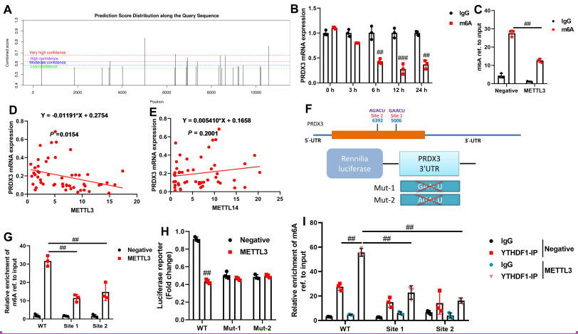 In osteoarthritis patients, the mRNA expression of PRDX3 was negatively correlated with METTL3 mRNA expression, but not with METTL14 mRNA expression (Figure 10D-E). There are m6A sites in the 3′-untranslated region (UTR) of PRDX3 (Figure 10F). METTL3 was significantly enriched in PRDX3 m6A modification at sites 1 and 2 (Figure 10G). METTL3 reduced the luciferase activity level by wild-type (WT) of PRDX3, while the mutant (Mut) PRDX3 did not (Figure 10H). The knockdown of YTHDF1 considerably alleviated the METTL3-induced reduction of PRDX3 m6A modification, suggesting that YTHDF1 knockdown could regulate PRDX3 m6A modification (Figure 10I). These findings revealed that METTL3-mediated m6A modification decreases PRDX3 stability in osteoarthritis via YTHDF1.
