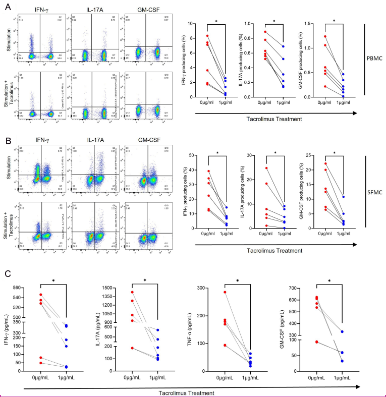 We aimed to determine whether tacrolimus treatment suppresses IFN-γ-, IL-17A-, and GM-CSF-producing cells in peripheral blood and synovial fluid from AS patients. PBMCs and SFMCs from AS patients were stimulated and cultured ex vivo for 24 hours in the presence or absence of tacrolimus. The percentages of IFN-γ, IL-17A, and GM-CSF-producing cells among total lymphocytes were analyzed using flow cytometry. Treatment with tacrolimus (1 μg/mL) significantly decreased the frequencies of IFN-γ-, IL-17A-, and GM-CSF-producing cells in PBMCs compared to untreated cells (Figure 1A). Similarly, consistent results were observed in SFMCs, where the frequencies of IFN-γ-, IL-17A-, and GM-CSFproducing cells were also significantly reduced following tacrolimus treatment (Figure 1B). Additionally, the levels of IFN-γ, IL-17A, TNF-α, and GM-CSF in PBMC supernatants were analyzed using ELISA assays. Tacrolimus treatment markedly reduced the production of all these cytokines in the supernatants of ex vivo cultured PBMCs (Figure 1C).