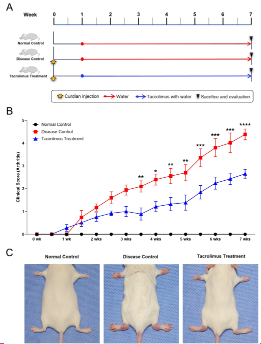 All experiments were conducted with the approval of the Institutional Animal Care and Use Committee of the Institutional Animal Care and Use Committee (CNU IACUC-H-2023-20, date: June 29, 2023). To evaluate the effect of tacrolimus on arthritis in in vivo model, SKG ([Sakaguchi] mouse) mice on a BALB/c background were obtained from CLEA Japan (Tokyo, Japan) and bred in a specific pathogen-free facility. In this study, all the mice were female, and the mice were categorized into 3 groups: a normal control group (n = 6 mice), a disease control group (n = 7 mice), and a tacrolimus treatment group (n = 10 mice). Experimental arthritis was induced in 8-week-old mice in both the disease control and tacrolimus treatment groups by intraperitoneal (i.p.) injection of 3 mg/kg of curdlan suspension (Wako, Osaka, Japan).