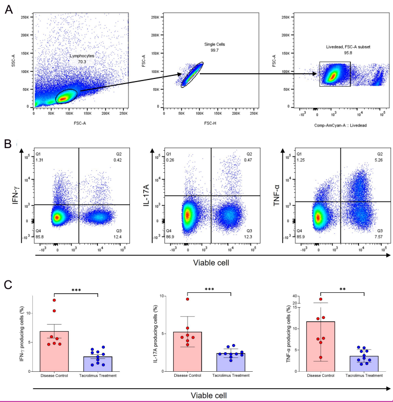 Splenocytes were isolated from the spleens of SKG mice. The gating strategy used for flow cytometry analysis is illustrated. Lymphocytes were initially gated based on size and granularity using forward scatter (FSC) and side scatter (SSC) parameters, comprising 70.3% of the total splenocyte population. Viable cells (95.8%) were then identified using Comp-AmCyan-A Livedead fluorescent staining (Figure 3A). The percentages of IFN-γ, IL-17A, and TNF-α-producing cells within the viable cell population were measured across groups. Representative flow cytometry plots showing the populations of IFNγ-, IL-17A-, and TNF-α-producing cells are presented (Figure 3B). The results revealed that the frequencies of IFN-γ-, IL-17A-, and TNF-α-producing cells from SKG splenocytes were significantly reduced in the tacrolimus treatment group compared to the disease control group. Specifically, tacrolimus-treated mice exhibited reduced frequencies of IFN-γ (6.93 ± 1.17 vs. 2.59 ± 0.35, P = .0010), IL-17A (5.27 ± 0.77 vs. 2.41 ± 0.19, P= .0006) and TNF-α (11.72 ± 3.52 vs. 3.66 ± 0.46, P= .0023) (Figure 3C).